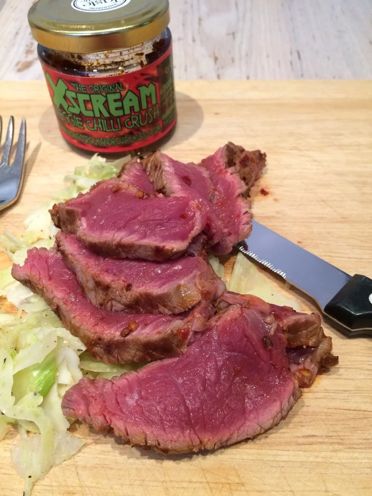 We marinated some steaks with our X-Scream Chilli Crush and cooked (barely) on the BBQ - simple and quick to do- DELICIOUS to eat!